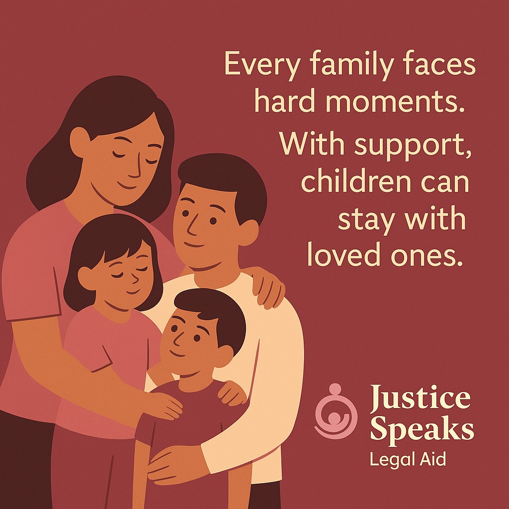 Justice Speaks Legal Aid provides free legal services and social-work support to families experiencing crisis. Our model combines legal advocacy with hands-on social-service intervention to keep children safely with their families and prevent unnecessary foster care placements.